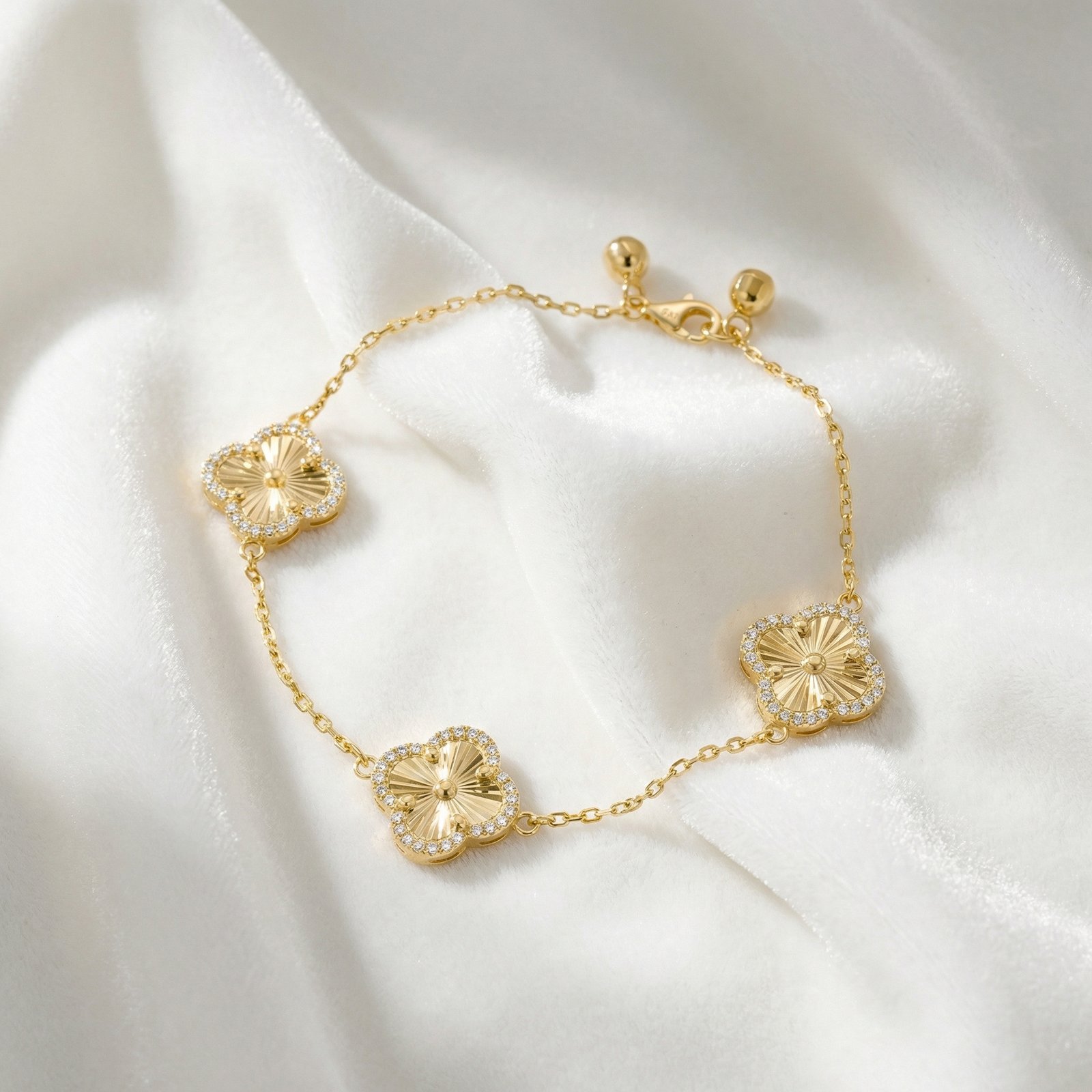 צמיד זהב 14k בעיצוב תלתנים עם חריטות לייזר לנצנוץ מקסימלי ושיבוץ מסביב